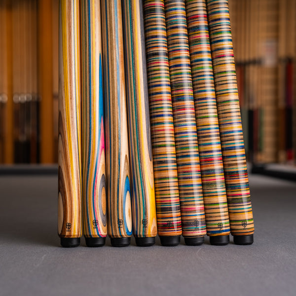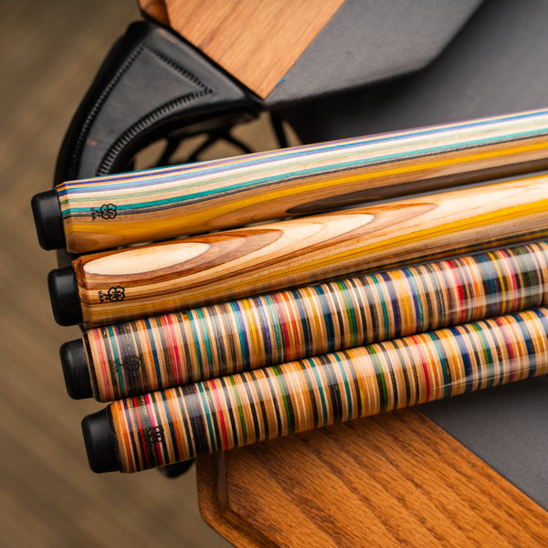 Each CHOPSP2 cue is handcrafted using reclaimed skateboard wood. Because of the nature of the material, every cue will differ in color, pattern, and appearance, making each one truly unique
