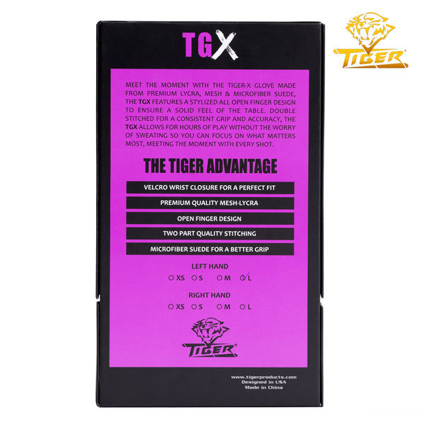 We took the original Tiger X glove and made it even better. Introducing the Tiger-X (TGX Pro Series) Billiard Glove—redesigned for improved fit, more inclusive sizing, and bold new color options that let you bring style to the table without sacrificing performance.