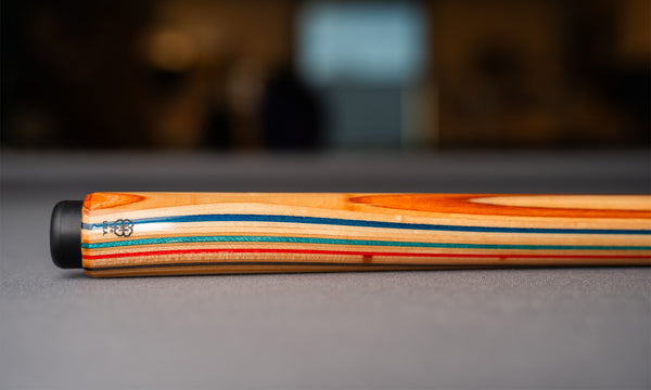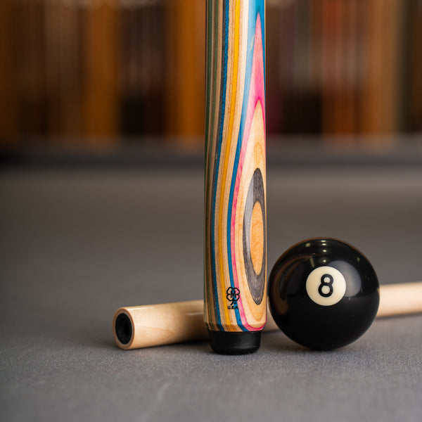 - Recycled Skateboard Wood Butt: Vertical skateboard wood layout showcases distinctive grain patterns and striking color variance — no two cues are alike