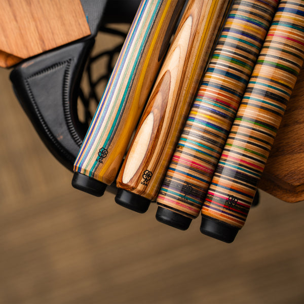 Each CHOPSP2 cue is handcrafted using reclaimed skateboard wood. Because of the nature of the material, every cue will differ in color, pattern, and appearance, making each one truly unique